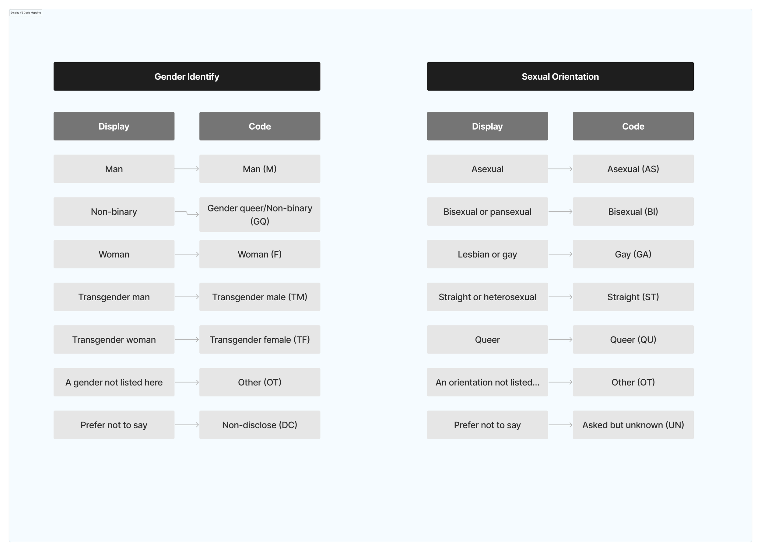 A challenge I came across was that the backend options for SOGI data did not directly align with the language HRC recommended. To solve this, I created a matrix for developers, ensuring that we displayed inclusive language and these selections accurately mapped to the limited options of our backend.